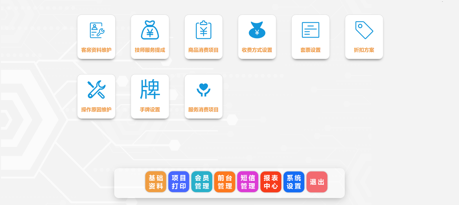 前臺(tái)管理系統(tǒng)可完成整個(gè)前臺(tái)營(yíng)業(yè)的全過(guò)程。包括開單、消單、并單、加牌、減牌、結(jié)算 管理、技師管理、客房管理等。
